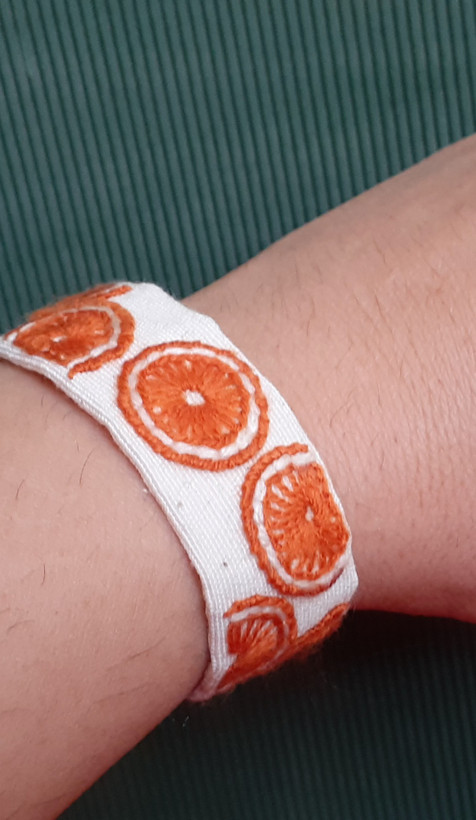 دستبند گلدوزی شده طرح پرتغال، با طراحی خلاقانه و استفاده از رنگ های شاد، برای کسانی که به دنبال استایل های خاص هستند، بسیار مناسب است.